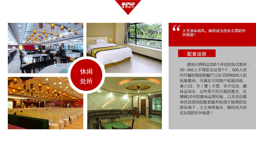 基地分擁有近200個(gè)床位的各式客房,30~300人不等的會(huì)議室7個(gè),500人同時(shí)開餐的高規(guī)格餐廳以及可容納500人的拓展基地??蓾M足不同客戶拓展訓(xùn)練、真人CS、冬(夏)令營(yíng)、親子活動(dòng)、趣味運(yùn)動(dòng)會(huì)、會(huì)務(wù)等不同方面的需求。