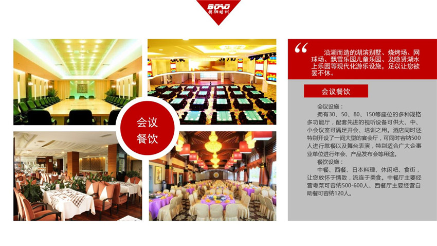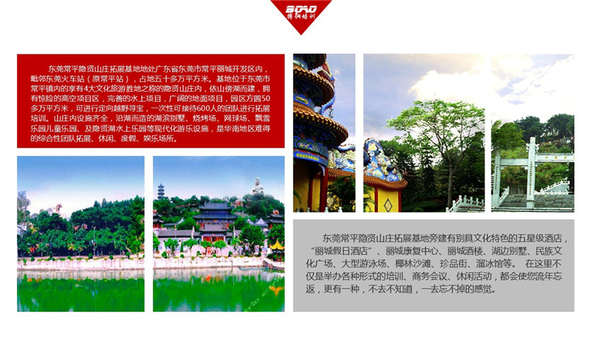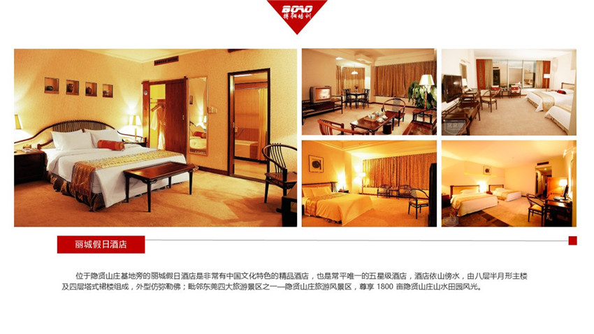 東莞常平隱賢山莊拓展基地旁建有別具文化特色的五星級酒店,“麗城假日酒店”、麗城康復(fù)中心、麗城酒樓、湖邊別墅、民族文化廣場、大型游泳場、椰林沙灘、珍品街、溜冰館等。 在這里不僅是舉辦各種形式的培訓(xùn)、商務(wù)會議、休閑活動,都會使您流年忘返,更有一種,不去不知道,一去忘不掉的感覺。