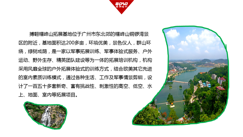 廣州帽峰山野戰(zhàn)拓展訓(xùn)練基地風(fēng)景宜人的位于廣州市東北郊的帽峰山銅鑼灣景區(qū)的附近,良田第一小學(xué)旁邊,占地面積200畝,可同時(shí)容納1000余名學(xué)員住宿和進(jìn)行拓展訓(xùn)練。是廣東地區(qū)設(shè)備齊全、場地寬闊、配套設(shè)施完備、持有省公安廳發(fā)放的彩彈合法槍牌的正規(guī)的野戰(zhàn)拓展基地?;匾浴昂霌P(yáng)愛國主義、普及國防教育、培育團(tuán)隊(duì)精神”為經(jīng)營主旨,為企事業(yè)提供專業(yè)的團(tuán)隊(duì)活動(dòng)服務(wù)。