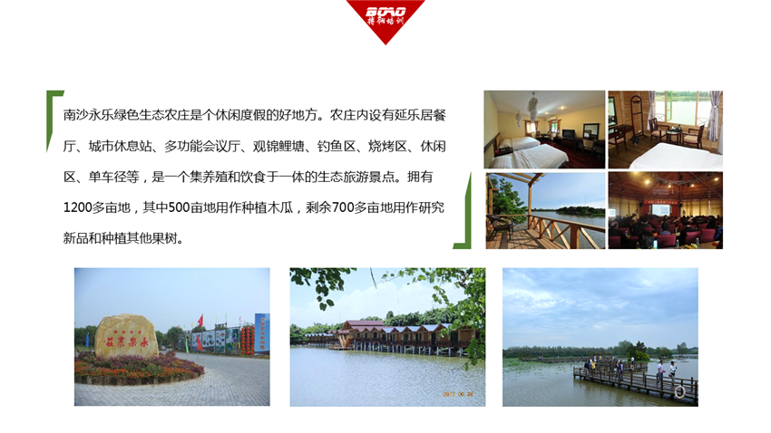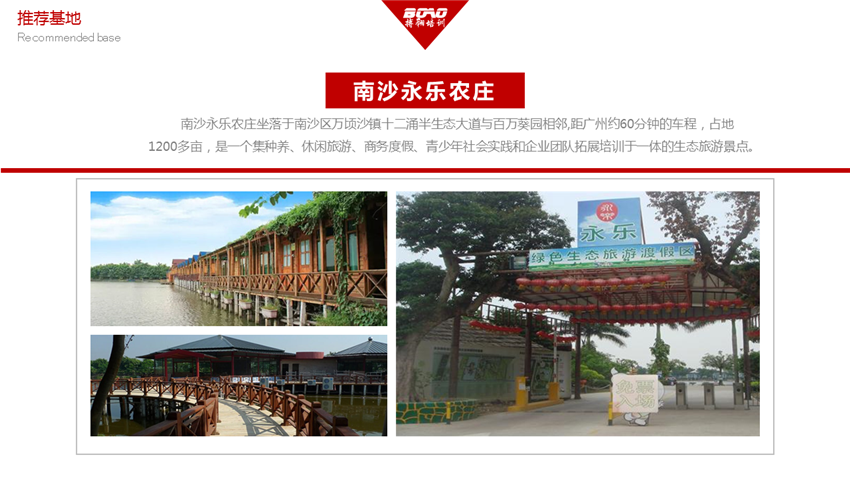 南沙永樂(lè)農(nóng)莊坐落于南沙區(qū)萬(wàn)頃沙鎮(zhèn)十二涌半生態(tài)大道與百萬(wàn)葵園相鄰,距廣州約60分鐘的車程,占地1200多畝,是一個(gè)集種養(yǎng)、休閑旅游、商務(wù)度假、青少年社會(huì)實(shí)踐和企業(yè)團(tuán)隊(duì)拓展培訓(xùn)于一體的生態(tài)旅游景點(diǎn);先后被評(píng)為廣州市青少年德育教育基地、廣州市青少年勞動(dòng)實(shí)踐基地,園內(nèi)設(shè)有延樂(lè)居餐廳、咖啡館、度假別墅區(qū)、植樹(shù)區(qū)、釣魚區(qū)、野炊區(qū)、燒烤區(qū)、智勇大沖關(guān)水上樂(lè)園、蕩秋千、人猿泰山、吊橋、網(wǎng)橋、蔬菜種植園、無(wú)公害水產(chǎn)養(yǎng)殖示范區(qū)、無(wú)公害種植示范區(qū)、高空拓展園、風(fēng)箏廣場(chǎng)、拔河區(qū)、竹筏競(jìng)技、同心板、野戰(zhàn)射擊場(chǎng)、休閑區(qū)、單車徑等;有可容納120人住宿的別墅、200人的會(huì)議中心、35人共一大圓桌用餐的豪華宴會(huì)廳,250人住宿的營(yíng)房、1000人露營(yíng)的帳篷及配套設(shè)備、1000人的野炊區(qū)、300人的燒烤區(qū)、500人同時(shí)用餐及品嘗特色沙田美食的餐廳、配有表演舞臺(tái)的室內(nèi)大廳和大廣場(chǎng)。