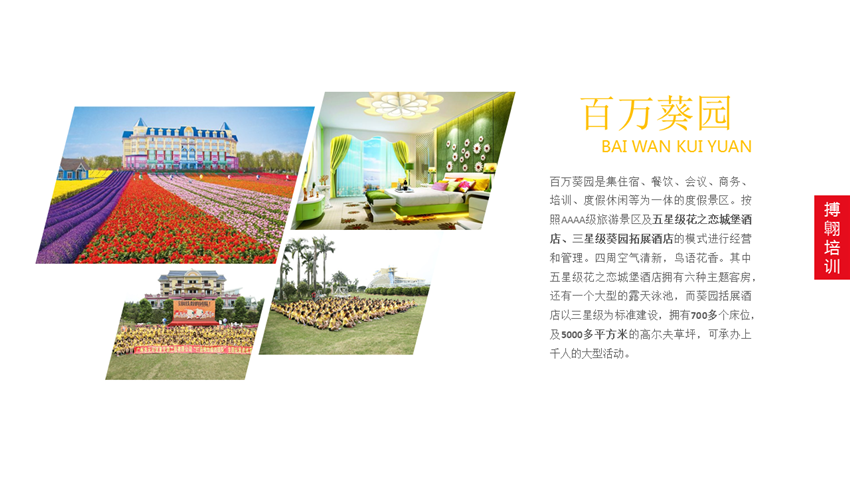 百萬葵園是集住宿、餐飲、會議、商務(wù)、培訓(xùn)、度假休閑等為一體的度假景區(qū)。按照AAAA級旅游景區(qū)及五星級花之戀城堡酒店、三星級葵園拓展酒店的模式進(jìn)行經(jīng)營和管理。四周空氣清新,鳥語花香。