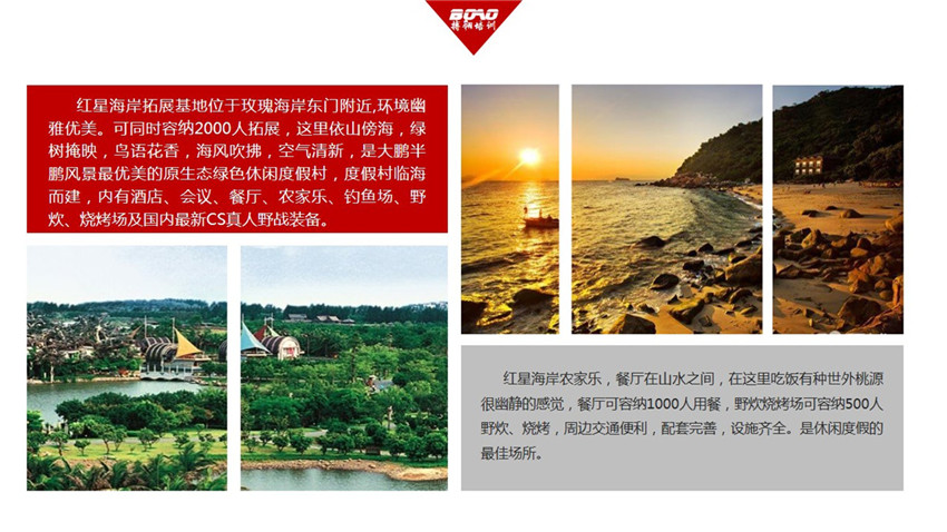 紅星海岸拓展基地位于南澳水頭沙,基地臨海而建,基地周邊有東部酒店用餐、會議、住房為一體的超值選擇,真味農(nóng)莊,最新冒煙裝備CS真人野戰(zhàn),野炊可同時容納500人進(jìn)行,原生態(tài)培訓(xùn)環(huán)境,可同時容納700人培訓(xùn);以及全天候燒烤場,多功能會議廳,可容納900人同時就餐的AAA級衛(wèi)生標(biāo)準(zhǔn)餐廳。